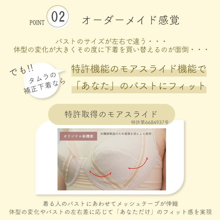 バストサイズの左右差にお悩みの方、月経・授乳の影響でバストの張りが変化しやすい方、体重の増減で下着サイズが変りやすい方、グラマーサイズでバストが安定しづらい方はぜひタムラのモアスライドをお試しください。