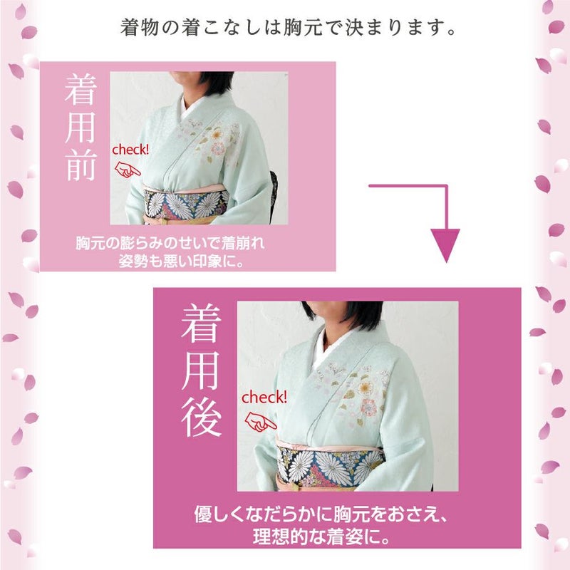 YouTubeで人気の方のおすすめを信頼して購入いたしました。胸上の部分が程よくふっくらして、きれいに着付けすることが出来、とても嬉しいです。