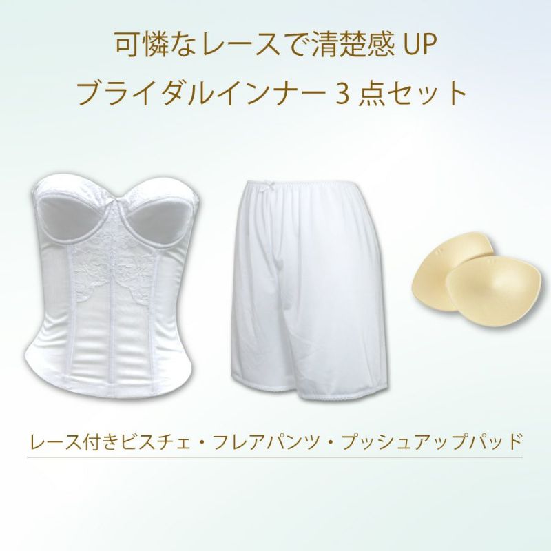 背中が開いたウエディングドレス・カラードレスにおすすめの、レース付きブライダルインナー3点セット(ベアバックビスチェ・フレアパンツ・パッド)です。