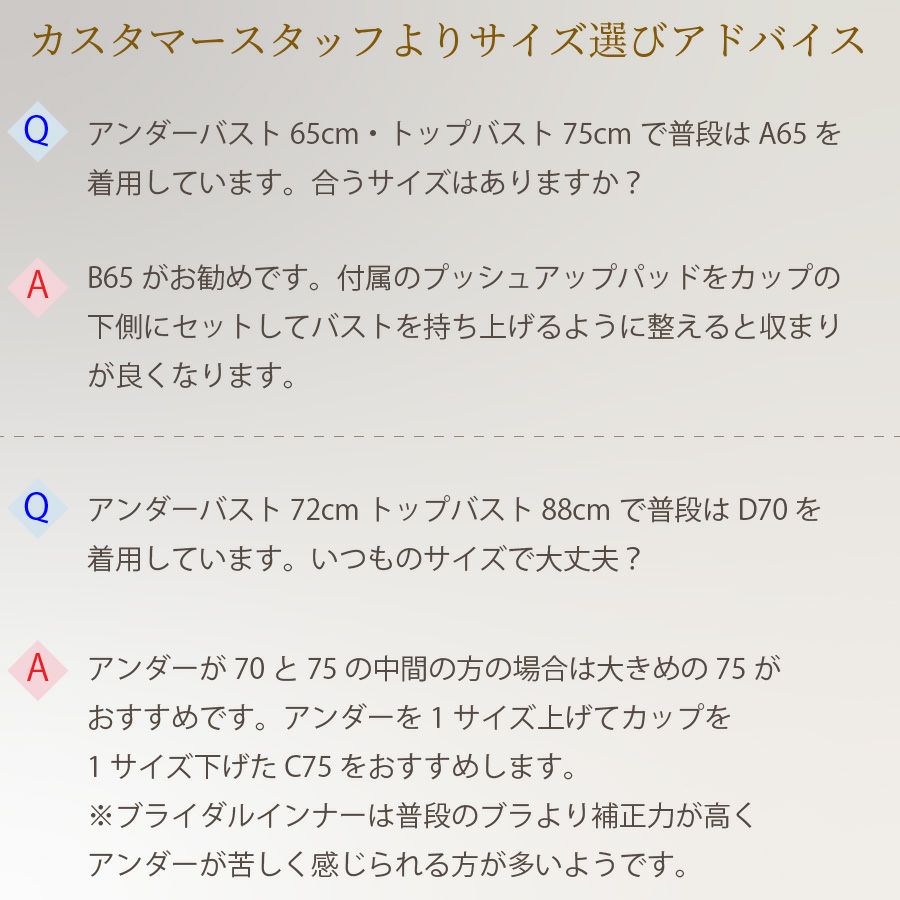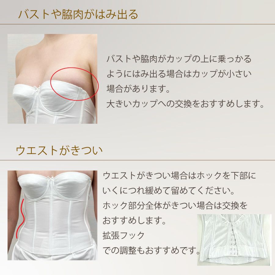 普段のブラジャーではストラップでバストをしっかり持ち上げていますが、ブライダルインナーはストラップレスで使用します。 カップも普段より浅いため、バストの集まりかたが異なります。 また、アンダーバストも着圧感のある着心地ですのでご注意ください。