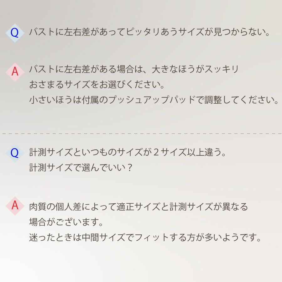 普段着用しているブラジャーのパッドを外して着用、もしくはヌード状態で計測をしてください。鏡を見ながらの計測をおススメいたします。