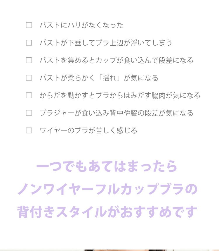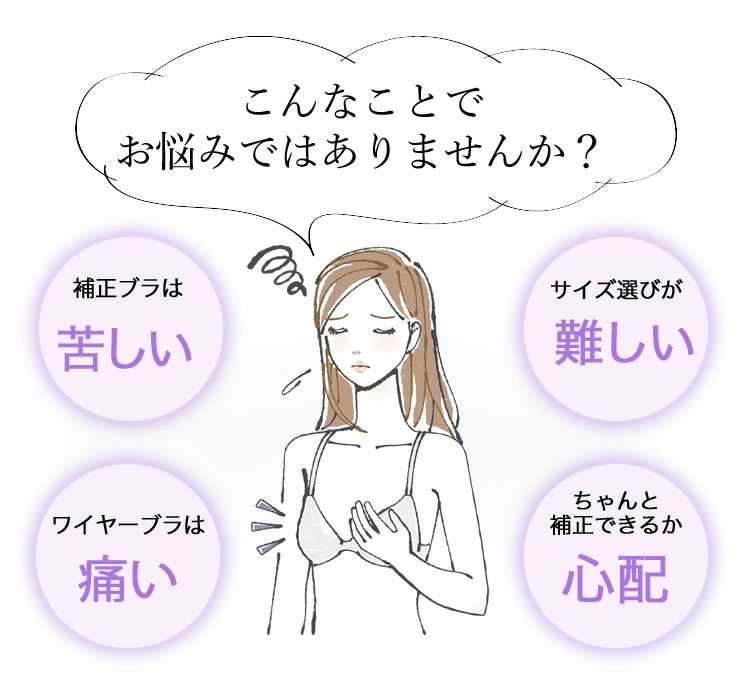 A. 問題ありません。タムラのノンワイヤーブラはアンダースライド式・モアスライド式などバストをしっかりと整える機能が搭載されているので、ラクさと補正力を兼ね備えています。