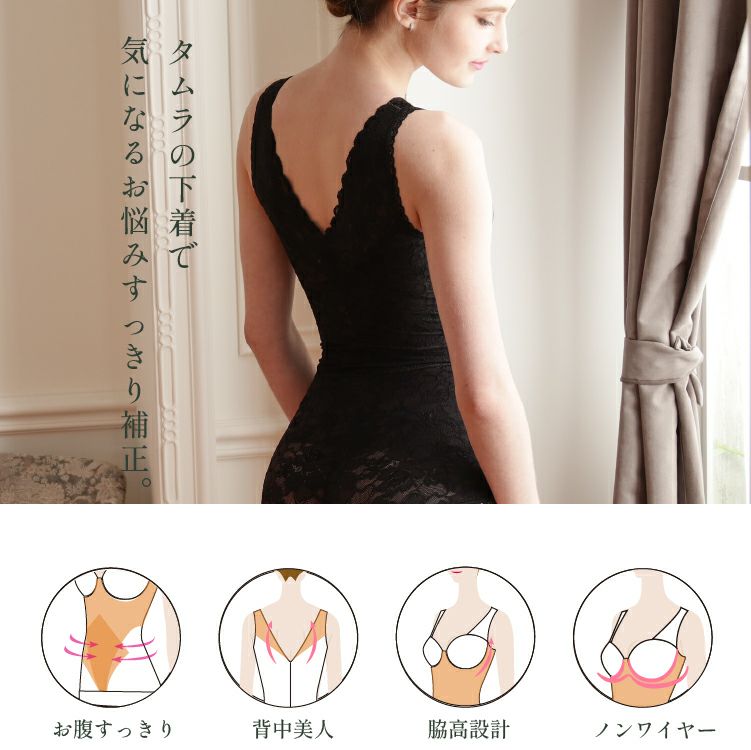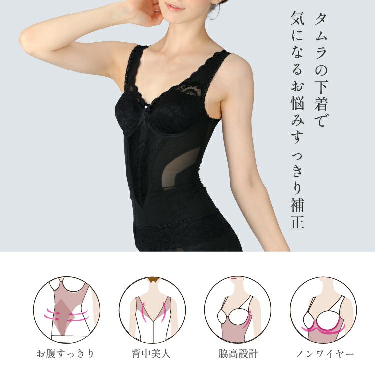 背中全体を整えるボディスーツやボディシェイパーだけでなく、 ブラジャーを選ぶときにもタムラの意匠登録「背付き」タイプや、 脇から背中にかけてのお肉をおさえる「脇高」タイプ等がおすすめです。