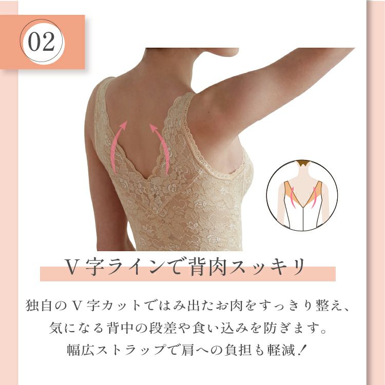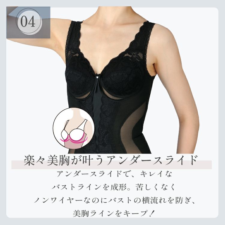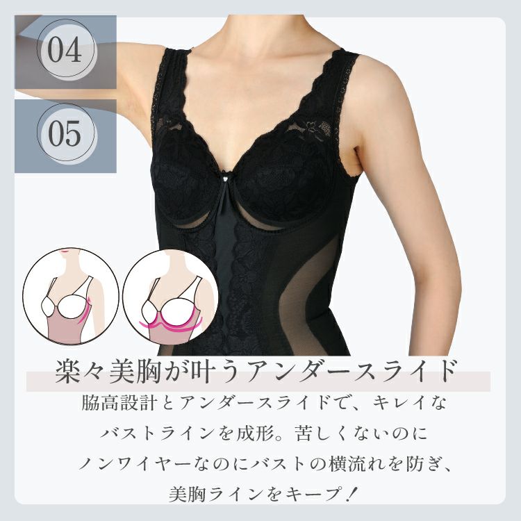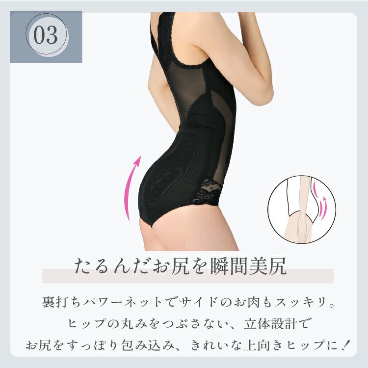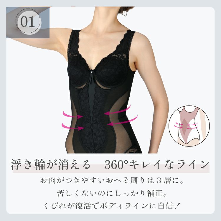 背付き機能が背中をきちんと整えレースなのになめらかな肌触りでストレスフリーな着心地の総レース多機能補正ボディスーツ