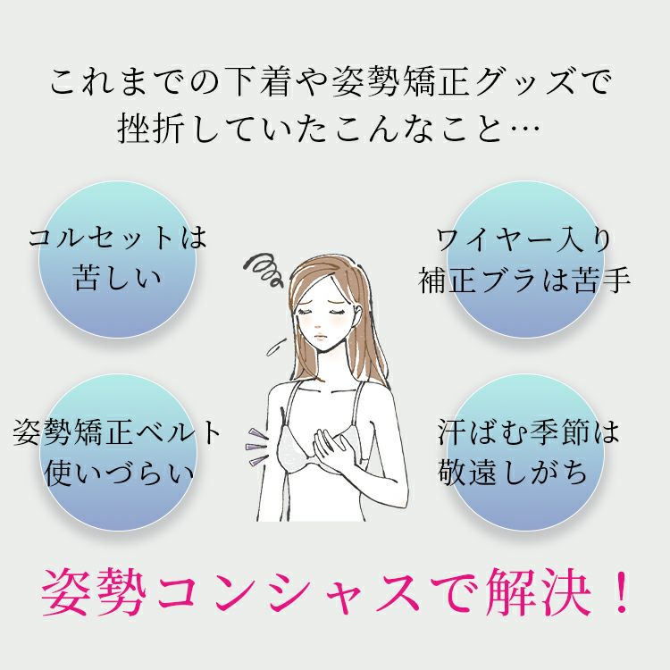バストアップシェイパー「姿勢コンシャス」TEQ04  姿勢の悪さは猫背が原因!?  猫背はスタイルアップの天敵  着るだけ簡単TEQ04  姿勢コンシャスのココがすごい!  着た瞬間「変わった!」が実感できる  バストの自然な丸みをキープ!  Wサポートで姿勢美人  バストを下から寄せ上げ!  締めつけないシェイプ力でくびれ美人  ラインレスでスッキリ  バストアップポイント  「伸びて」「縮む力」で快適に体にフィット!  オールシーズン快適  補正下着の挫折を姿勢コンシャスで解決  補正矯正下着比較表  色の種類=ブラック  色の種類=グレージュ  対応サイズ表  スタッフの着用レビュー  骨盤サポートガードルでさらに姿勢美人