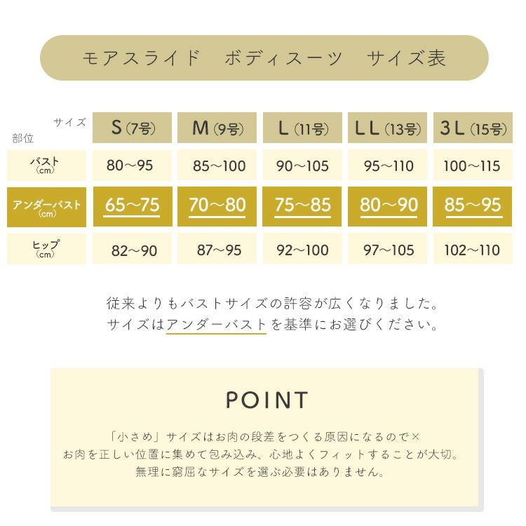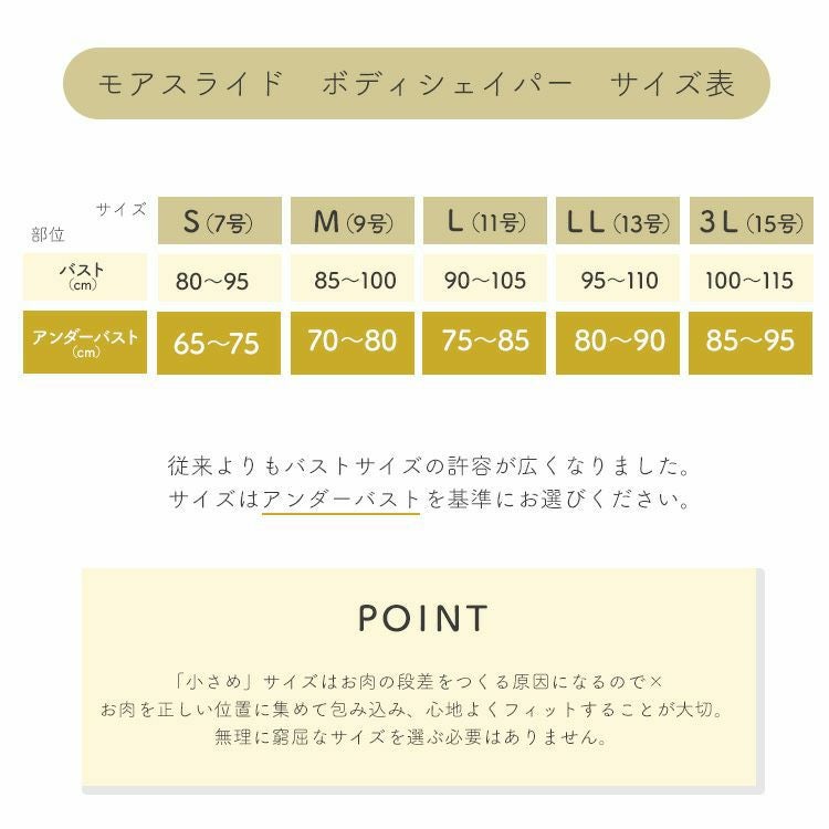 また、年齢を重ねて、柔らかく流れやすいバストもしっかりキープ。 モアスライドシリーズのボディスーツ・ボディシェイパー・ブラジャーは、そんな日々変化するバストのお悩みを解決します。