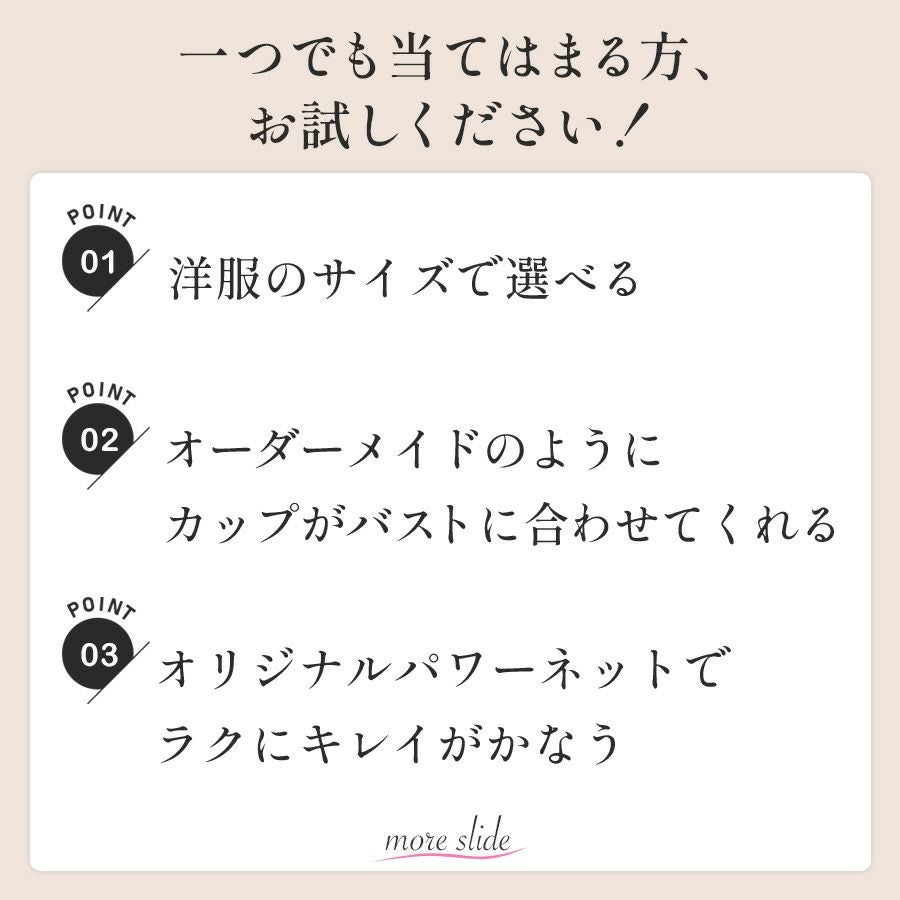 カップやアンダーバストが食い込みやすいグラマーバストもモアスライドの機能でしっかり包み込みます。