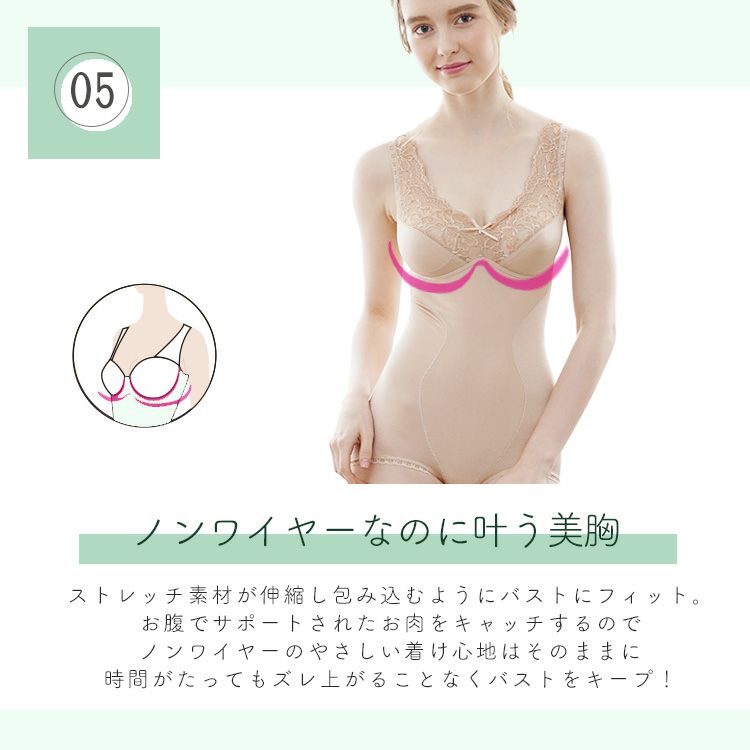 マシュマロタッチなふんわり素材で、気になるお肉をすっぽり包み込み、なめらかに整えるボディスーツです。