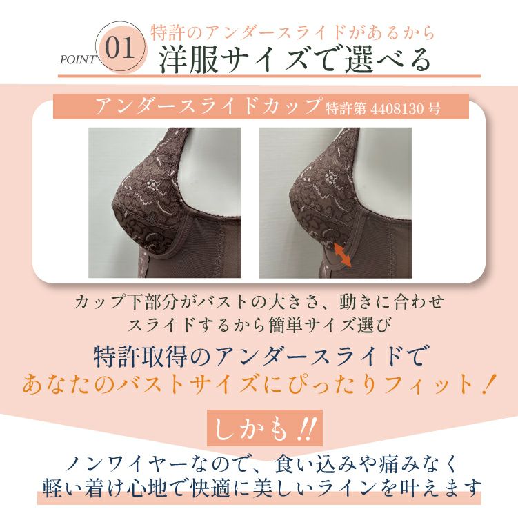 特許のアンダースライド機能のほか、背中のお肉の段差もしっかりサポートする背付スタイル。