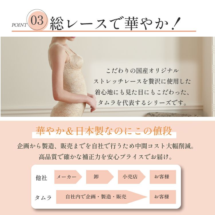 しっかり補正してくれるけれど、締め付け感はなく、 着ていると総レースなのでリッチな気持ちになります。 3回目のリピートです。今まではロイヤルステージで購入していました。